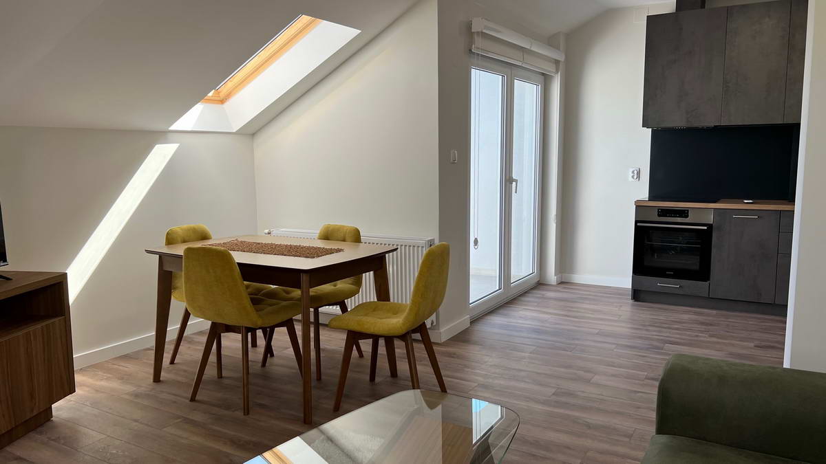 IZDAVANJE – Centar – dvosoban stan u novogradnji. Rezidenciono stanovanje. Svega četiri stana u zgradi. 50m2 od čega je terasa sa pogledom ka Begeju i mostu kod SUP-a 5m2. Na drugom spratu (potkrovlje). Kuhinja je opremljena kvalitetnim kuhinskim elementima sa ugradnom pločom i rernom. Podno grejanje preko kondenzacionog, protočnog kotla. Sanitarna voda se takođe zagreva preko gasnog kotla i napaja kupatilo preko bafera kapaciteta 200l. Klimatizovano. Stan je opremljen kvalitetnim nameštajem. Kompletna zgrada je pokriena video nadzorom. Video interfon. U kupatilu je kvalitetna italijanska keramika. Spoljna stolarija je sa niskoemisionim staklima, roletnama i rolo komarnicima. Stanu pripada uređeno parking mesto. Nekretnina sa kvalitetom i lokacijom kakva se retko nalazi na tržištu. Cena je 500e/mesec sa uračunatim komunalnim troškovima