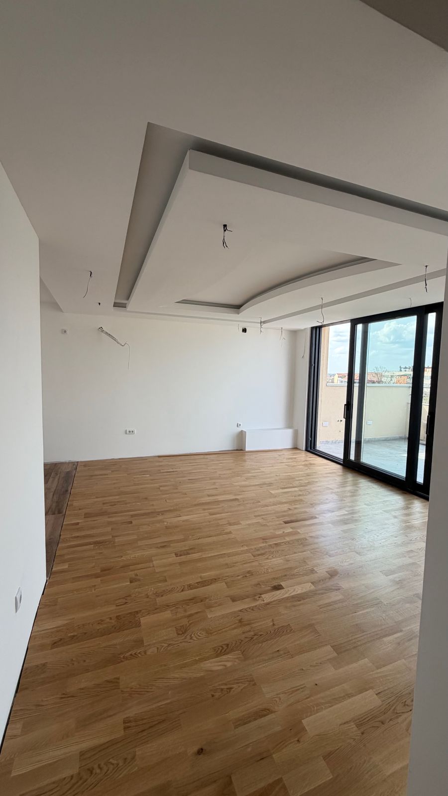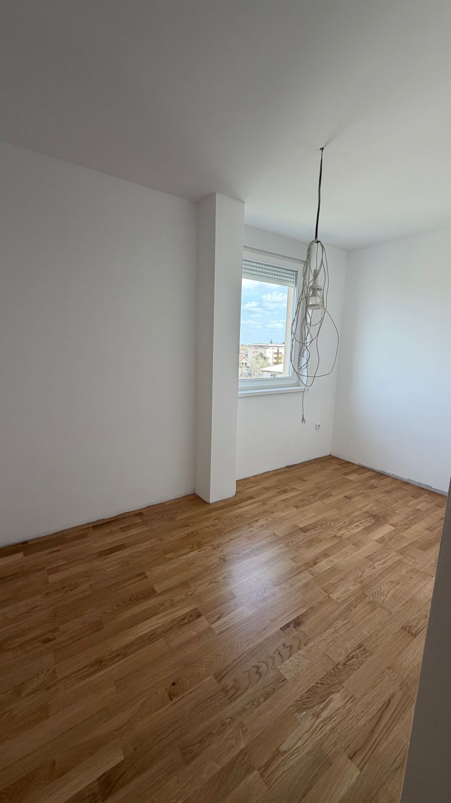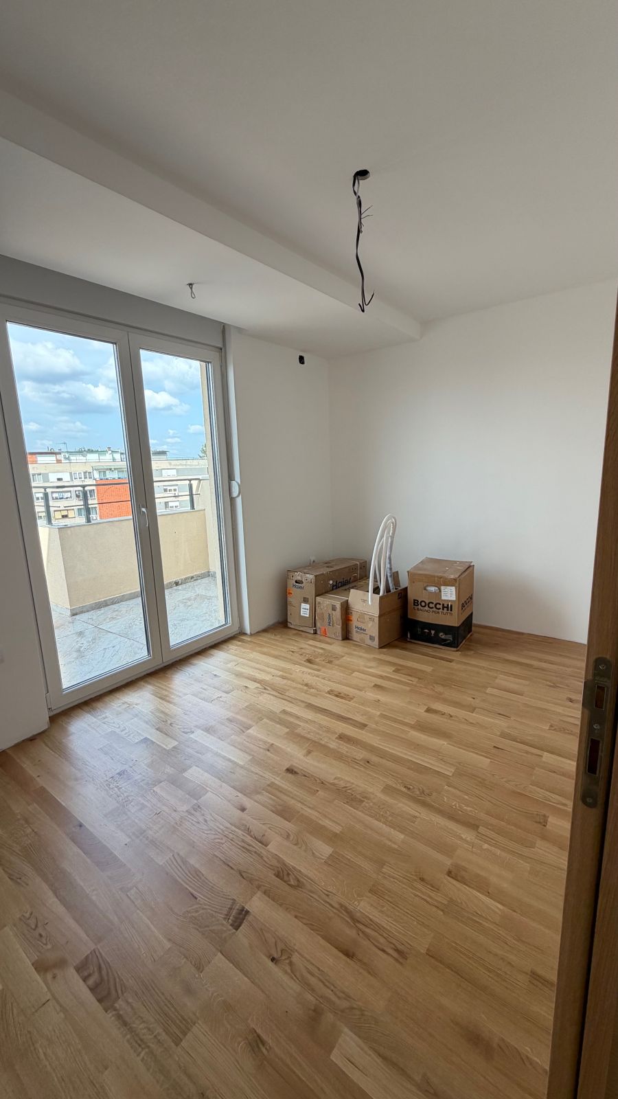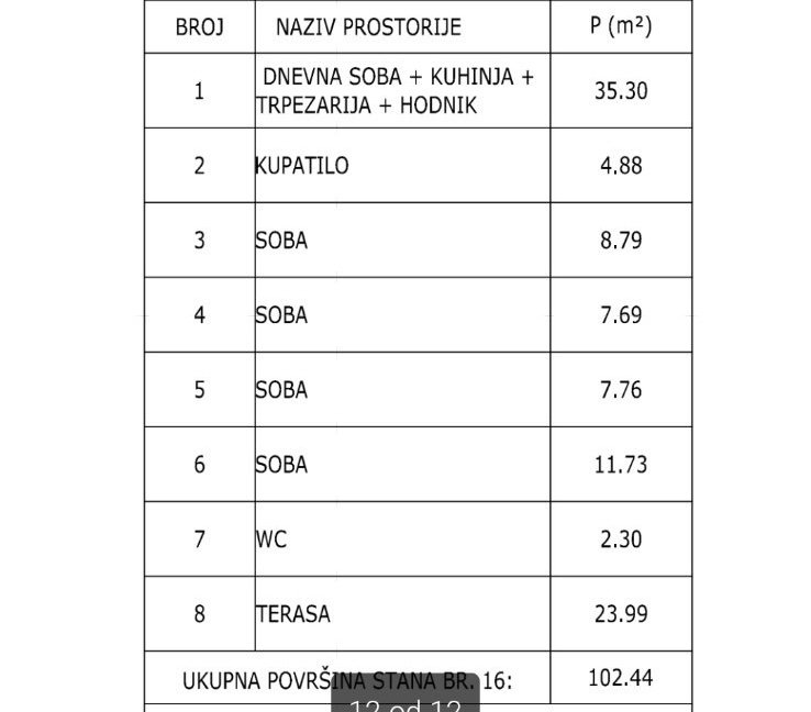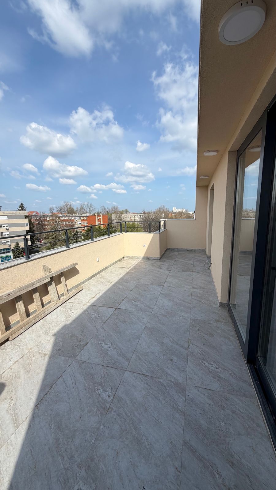 Lesnina – NOVOGRADNJA – petosoban stan površine 102m2 (78m2 stambeni prostor + 24m2 terasa) na petom spratu u stambenoj zgradi s liftom. Podno grejanje (takođe i na terasi), tarket, spušteni plafoni gipsom, kupatilo + toalet.