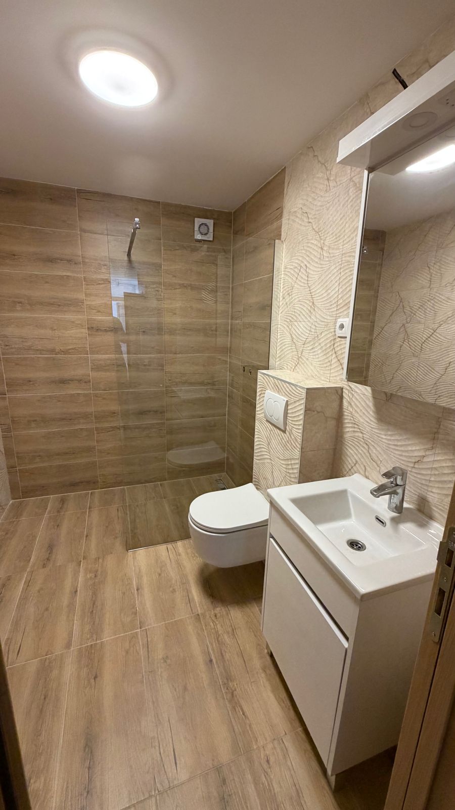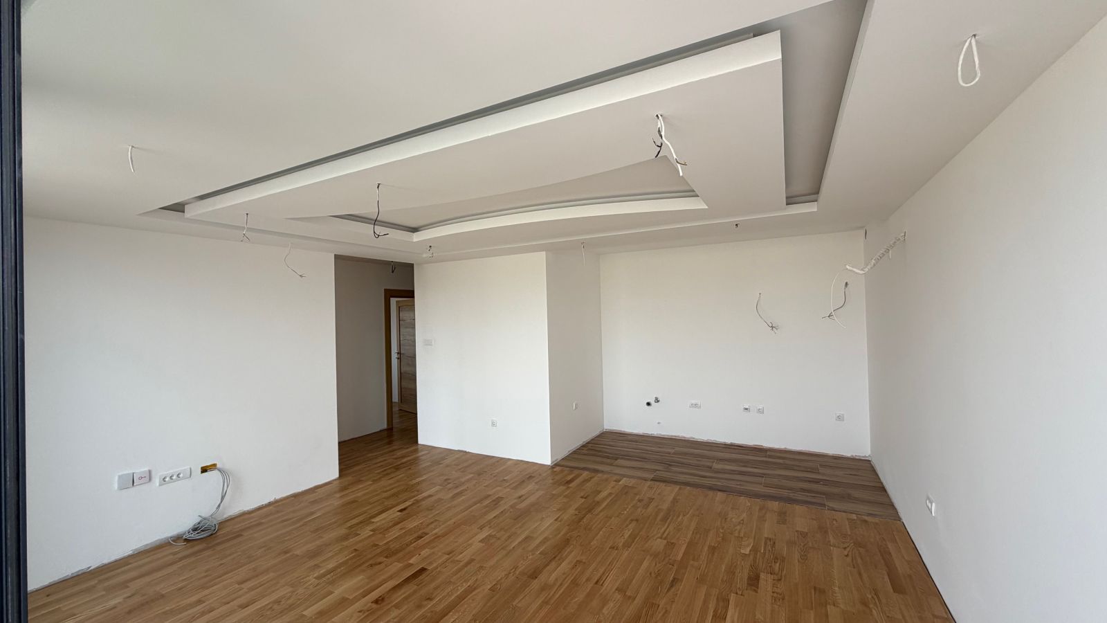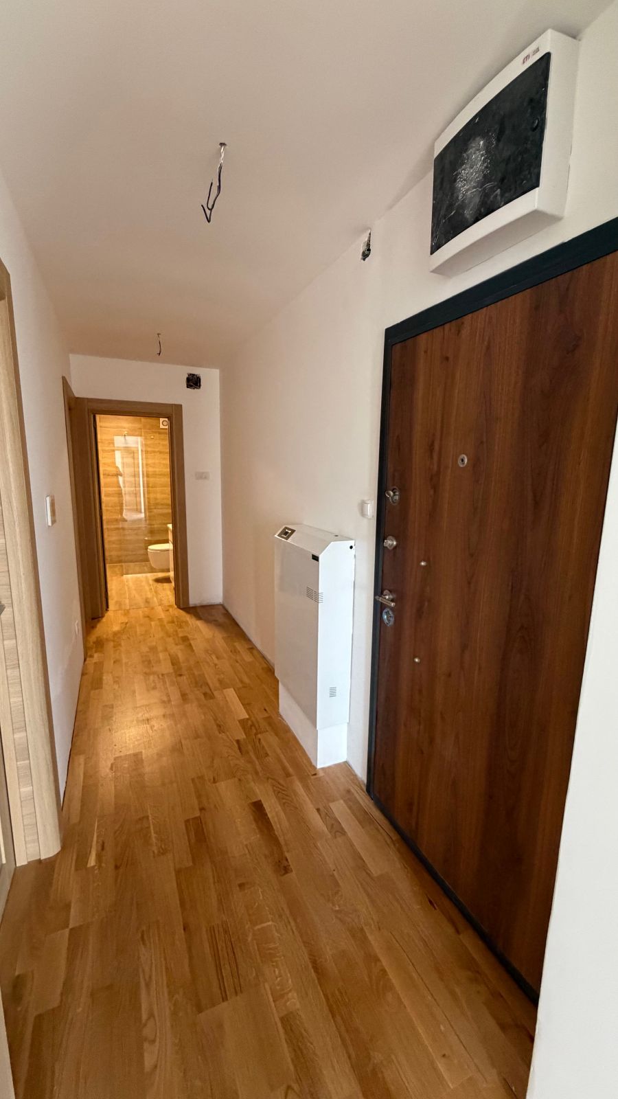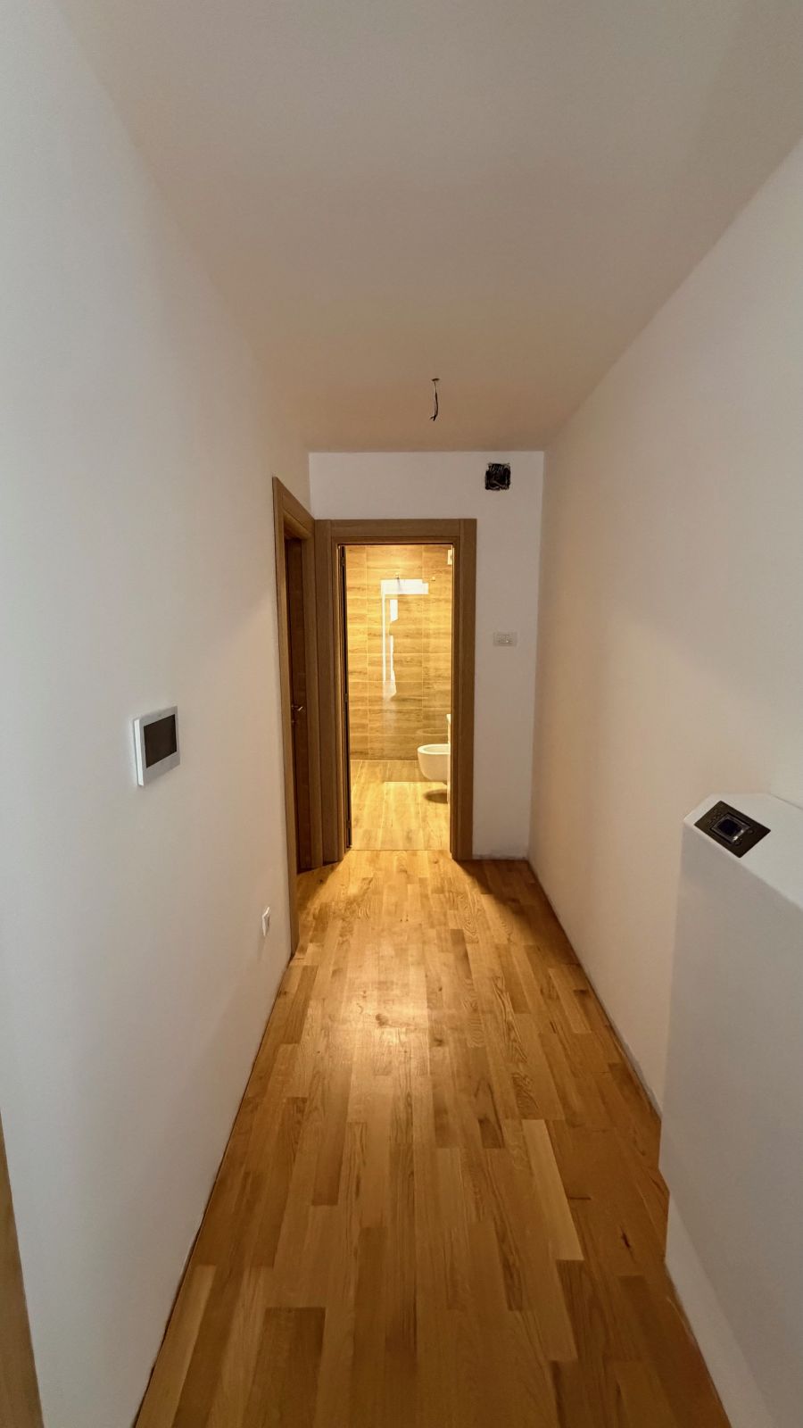 Lesnina – NOVOGRADNJA – petosoban stan površine 102m2 (78m2 stambeni prostor + 24m2 terasa) na petom spratu u stambenoj zgradi s liftom. Podno grejanje (takođe i na terasi), tarket, spušteni plafoni gipsom, kupatilo + toalet.